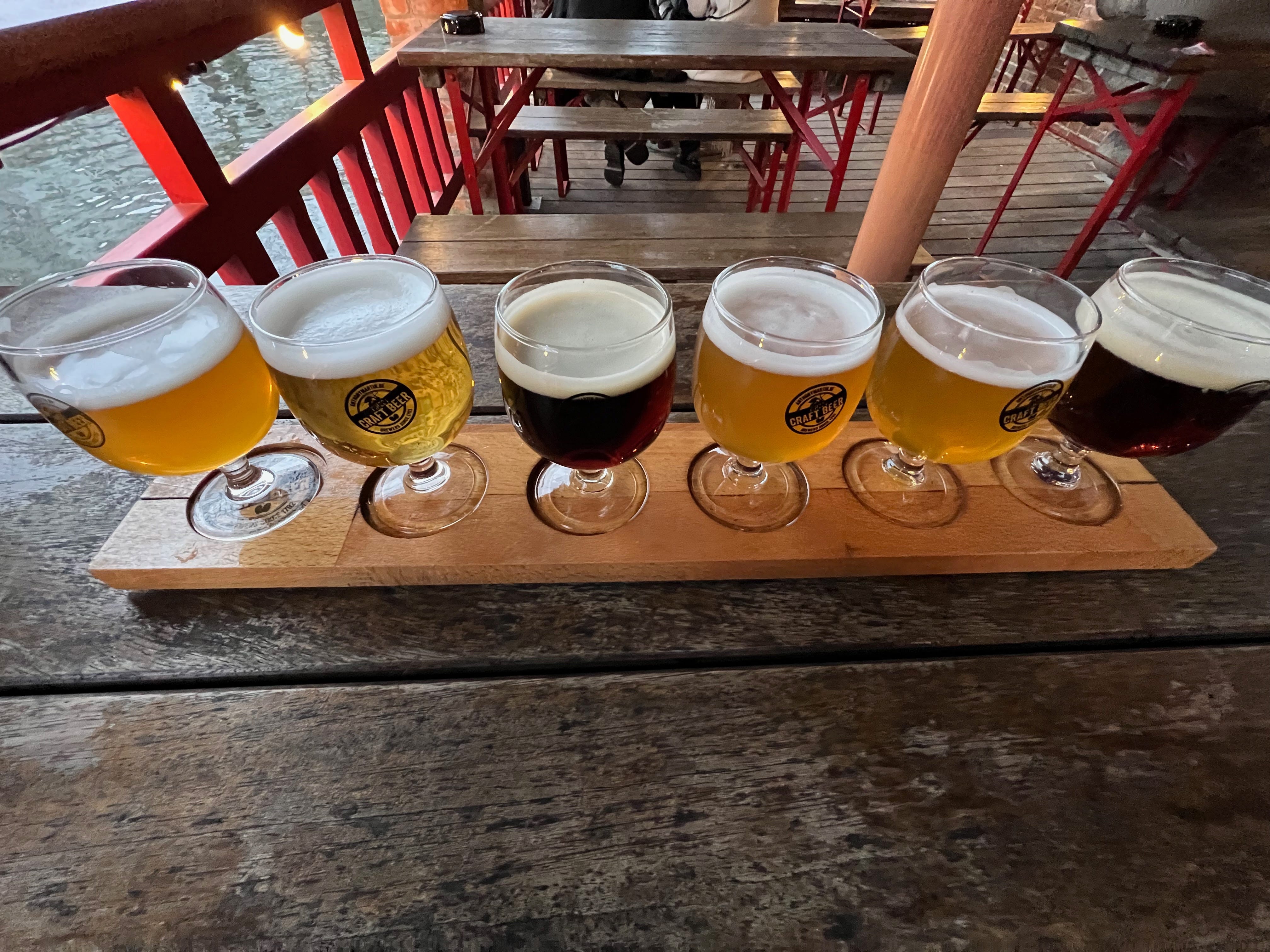 Later that afternoon, Brugge indulged us once more. On the outdoor patio of a canal-side bar, we ordered a flight of Belgian ales. The lineup was a master class in flavor: crisp golden triples that sparkled like morning sunlight, velvety dark stouts with hints of coffee and chocolate, and fruity lambics that tasted like spring. Between sips, we nibbled on slices of aged gouda paired with tangy mustard. The March chill was tempered by patio heaters and we were kept dry by the large umbrellas as we watched the last tour boats float lazily by, their wakes rippling softly against the canal walls. Above the gentle hum of conversation, the city whispered its timeless secrets.